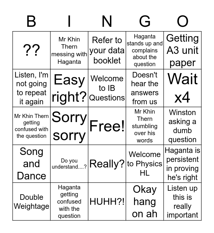 This bingo card has a free space and 24 words: Double Weightage, Do you understand....?, Welcome to IB Questions, Okay hang on ah, Getting A3 unit paper, ??, Mr Khin Thern messing with Haganta, Refer to your data booklet, Mr Khin Thern stumbling over his words, Winston asking a dumb question, Mr Khin Thern getting confused with the question, Easy right?, Welcome to Physics HL, Haganta is persistent in proving he's right, Listen, I'm not going to repeat it again, Haganta getting confused with the question, HUHH?!, Haganta stands up and complains about the question, Wait x4, Song and Dance, Sorry sorry, Really?, Doesn't hear the answers from us and Listen up this is really important.