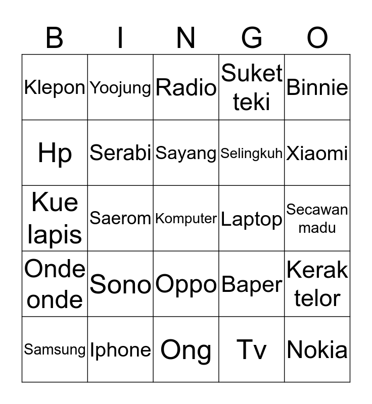 This bingo card has a free space and 24 words: Sono, Iphone, Sayang, Samsung, Binnie, Klepon, Hp, Yoojung, Laptop, Oppo, Selingkuh, Kue lapis, Baper, Kerak telor, Serabi, Tv, Secawan madu, Radio, Xiaomi, Saerom, Nokia, Onde onde, Suket teki and Ong.
