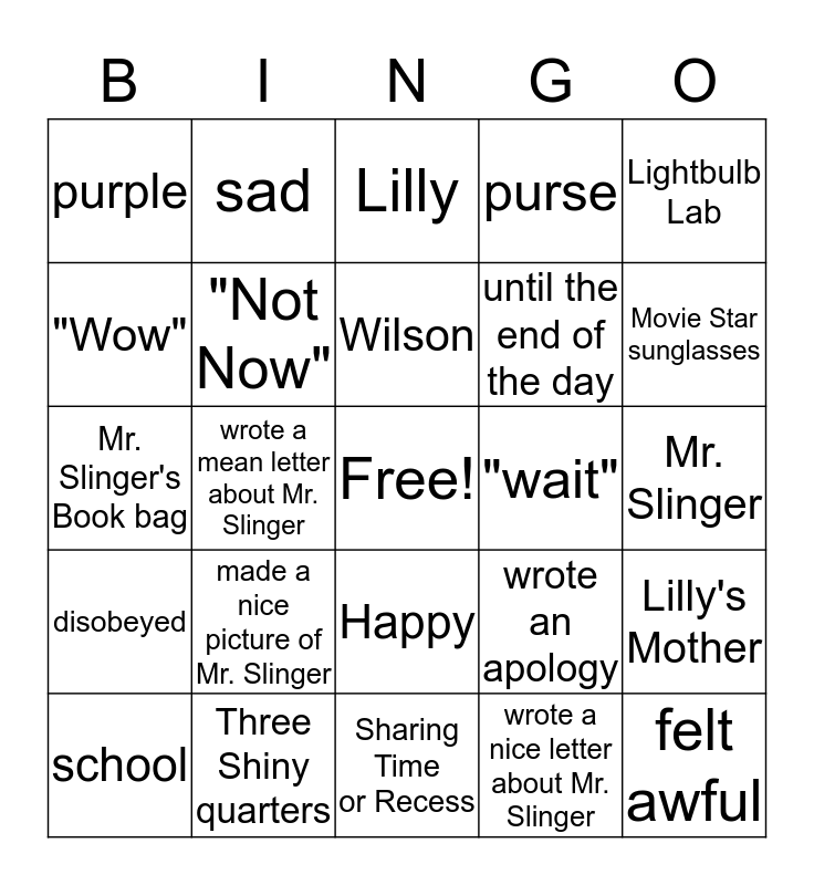 This bingo card has a free space and 24 words: school, made a nice picture of Mr. Slinger, Wilson, wrote a nice letter about Mr. Slinger, Lightbulb Lab, purple, sad, Lilly, "wait", Mr. Slinger, Mr. Slinger's Book bag, "Not Now", wrote an apology, Lilly's Mother, "Wow", Three Shiny quarters, Sharing Time or Recess, purse, Movie Star sunglasses, disobeyed, wrote a mean letter about Mr. Slinger, Happy, until the end of the day and felt awful.