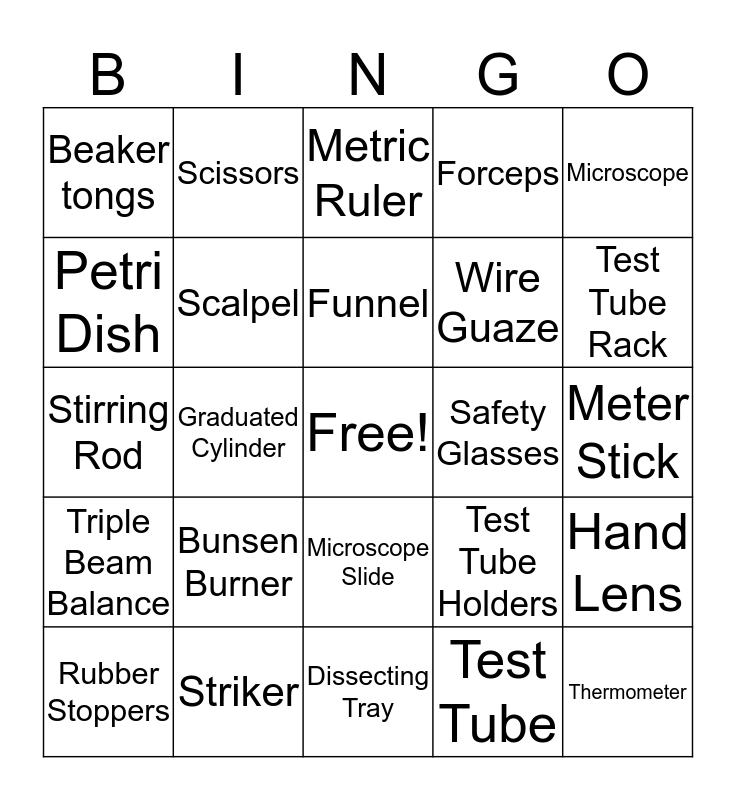 This bingo card has a free space and 24 words: Bunsen Burner, Striker, Funnel, Rubber Stoppers, Microscope, Beaker tongs, Petri Dish, Scissors, Safety Glasses, Microscope Slide, Wire Guaze, Stirring Rod, Test Tube Holders, Hand Lens, Scalpel, Test Tube, Meter Stick, Metric Ruler, Test Tube Rack, Graduated Cylinder, Thermometer, Triple Beam Balance, Forceps and Dissecting Tray.