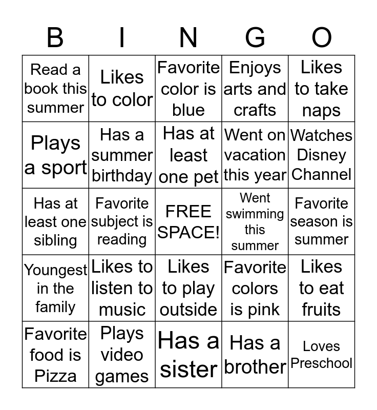 This bingo card has a free space and 24 words: Favorite food is Pizza, Likes to listen to music, Has at least one pet, Has a brother, Likes to take naps, Read a book this summer, Likes to color, Favorite color is blue, Went swimming this summer, Favorite season is summer, Has at least one sibling, Has a summer birthday, Favorite colors is pink, Likes to eat fruits, Plays a sport, Plays video games, Has a sister, Enjoys arts and crafts, Watches Disney Channel, Youngest in the family, Favorite subject is reading, Likes to play outside, Went on vacation this year and Loves Preschool.