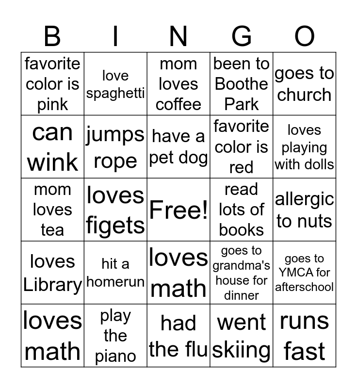 This bingo card has a free space and 25 words: hit a homerun, had the flu, have a pet dog, loves math, goes to church, favorite color is pink, can wink, love spaghetti, read lots of books, loves math, favorite color is red, mom loves tea, goes to grandma's house for dinner, goes to YMCA for afterschool, jumps rope, loves playing games, allergic to nuts, mom loves coffee, loves playing with dolls, loves figets, runs fast, play the piano, loves Library, been to Boothe Park and went skiing.