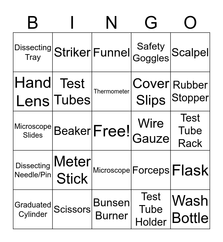This bingo card has a free space and 24 words: Meter Stick, Scissors, Thermometer, Graduated Cylinder, Scalpel, Dissecting Tray, Hand Lens, Striker, Wire Gauze, Microscope, Cover Slips, Microscope Slides, Forceps, Flask, Test Tubes, Test Tube Holder, Test Tube Rack, Funnel, Rubber Stopper, Beaker, Wash Bottle, Dissecting Needle/Pin, Safety Goggles and Bunsen Burner.