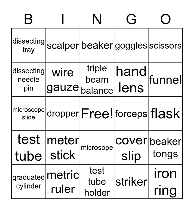 This bingo card has a free space and 24 words: meter stick, metric ruler, triple beam balance, graduated cylinder, scissors, dissecting tray, dissecting needle pin, scalper, forceps, microsope, hand lens, microscope slide, cover slip, beaker tongs, wire gauze, striker, flask, beaker, funnel, dropper, iron ring, test tube, goggles and test tube holder.