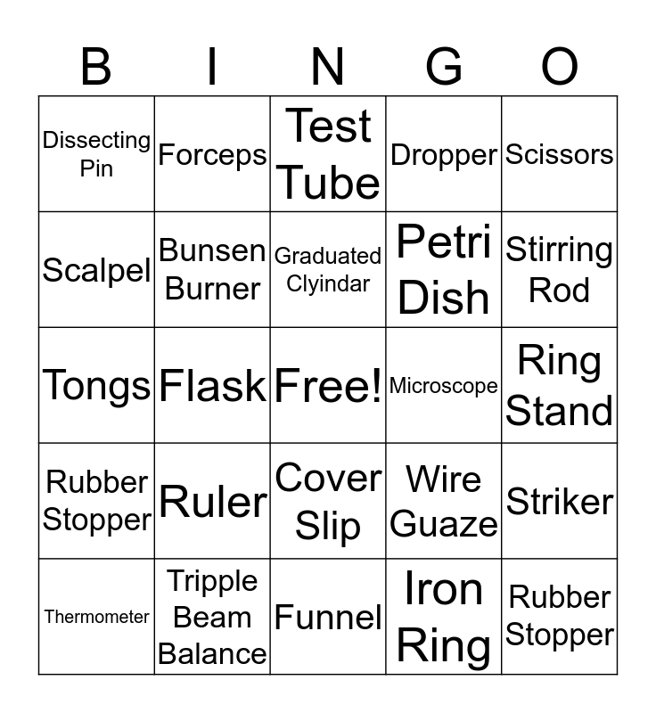 This bingo card has a free space and 24 words: Ruler, Tripple Beam Balance, Graduated Clyindar, Thermometer, Scissors, Dissecting Pin, Scalpel, Forceps, Microscope, Cover Slip, Petri Dish, Tongs, Wire Guaze, Striker, Bunsen Burner, Iron Ring, Ring Stand, Test Tube, Stirring Rod, Flask, Rubber Stopper, Rubber Stopper, Dropper and Funnel.