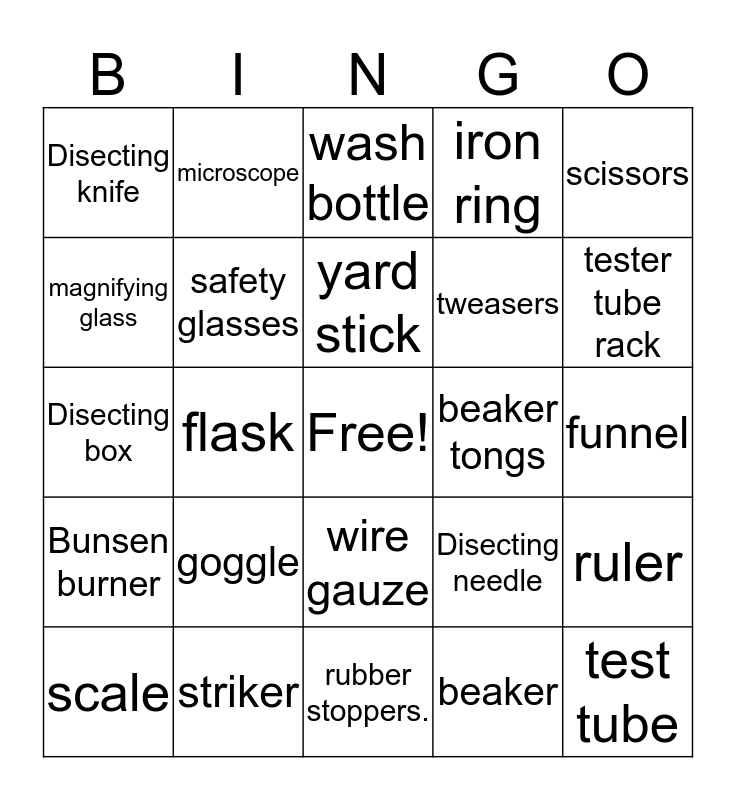 This bingo card has a free space and 24 words: goggle, striker, yard stick, scale, scissors, Disecting knife, magnifying glass, microscope, beaker tongs, wire gauze, tweasers, Disecting box, Disecting needle, ruler, safety glasses, beaker, funnel, wash bottle, tester tube rack, flask, test tube, Bunsen burner, iron ring and rubber stoppers..