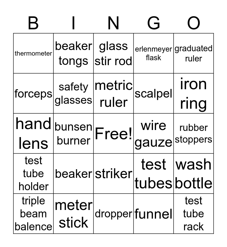 This bingo card has a free space and 24 words: beaker, meter stick, metric ruler, triple beam balence, graduated ruler, thermometer, forceps, beaker tongs, wire gauze, striker, scalpel, hand lens, test tubes, wash bottle, safety glasses, funnel, rubber stoppers, glass stir rod, iron ring, bunsen burner, test tube rack, test tube holder, erlenmeyer flask and dropper.