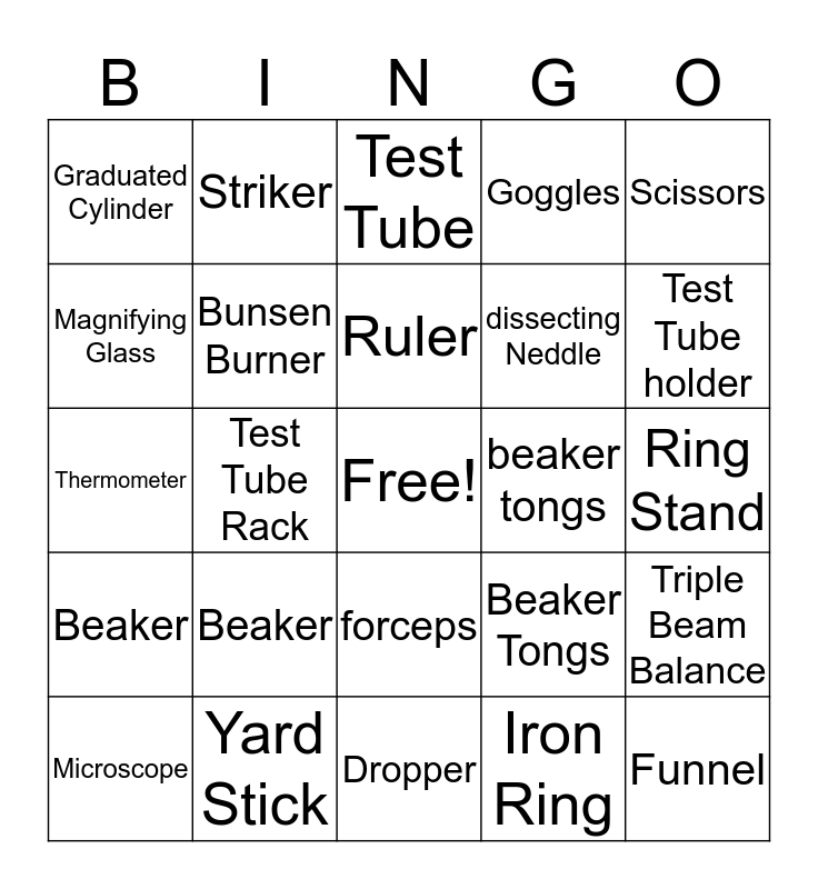 This bingo card has a free space and 24 words: Beaker, Yard Stick, Ruler, Microscope, Scissors, Graduated Cylinder, Magnifying Glass, Striker, beaker tongs, forceps, dissecting Neddle, Thermometer, Beaker Tongs, Triple Beam Balance, Bunsen Burner, Iron Ring, Ring Stand, Test Tube, Test Tube holder, Test Tube Rack, Funnel, Beaker, Goggles and Dropper.