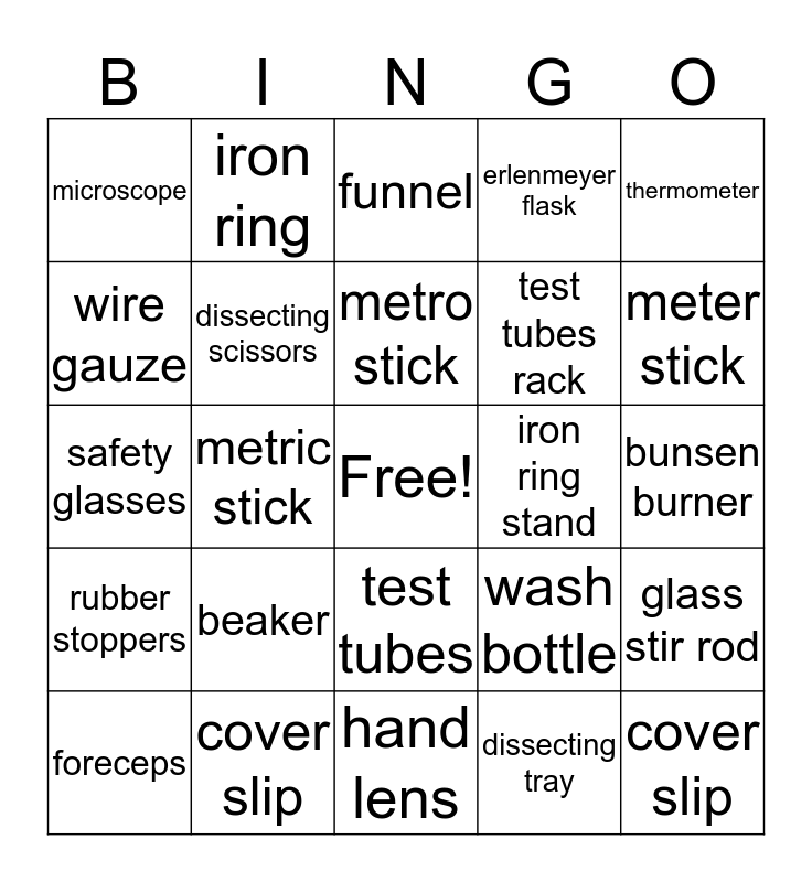 This bingo card has a free space and 24 words: beaker, cover slip, metro stick, foreceps, thermometer, microscope, wire gauze, iron ring, iron ring stand, test tubes, test tubes rack, safety glasses, wash bottle, glass stir rod, dissecting scissors, dissecting tray, bunsen burner, funnel, meter stick, metric stick, cover slip, rubber stoppers, erlenmeyer flask and hand lens.