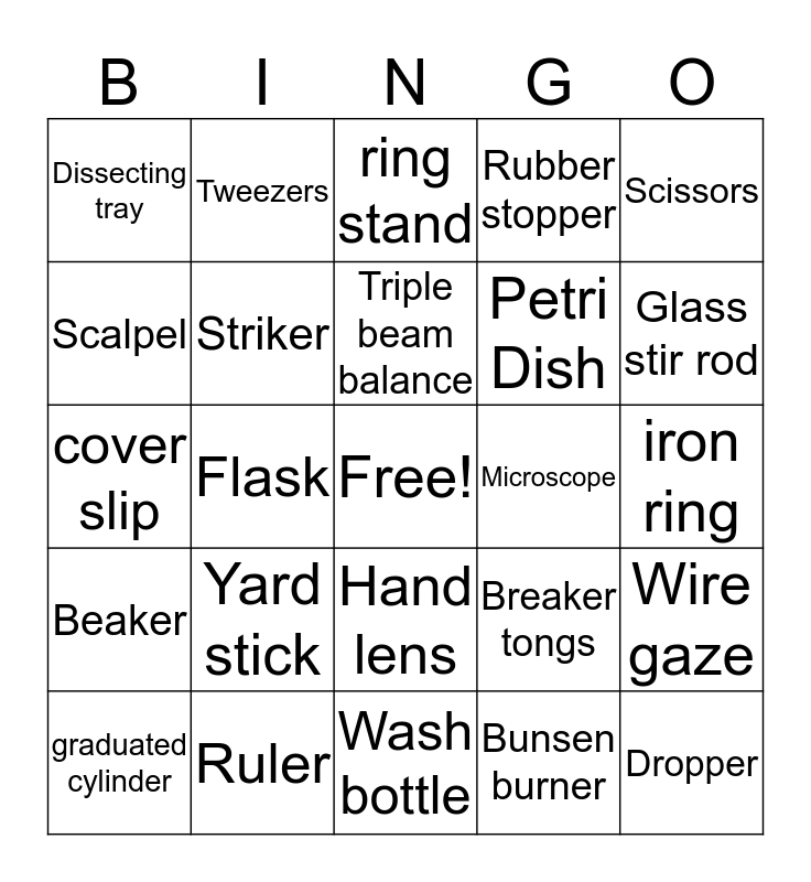 This bingo card has a free space and 24 words: Yard stick, Ruler, Triple beam balance, graduated cylinder, Scissors, Dissecting tray, Scalpel, Tweezers, Microscope, Hand lens, Petri Dish, cover slip, Breaker tongs, Wire gaze, Striker, Bunsen burner, iron ring, ring stand, Glass stir rod, Flask, Dropper, Beaker, Rubber stopper and Wash bottle.