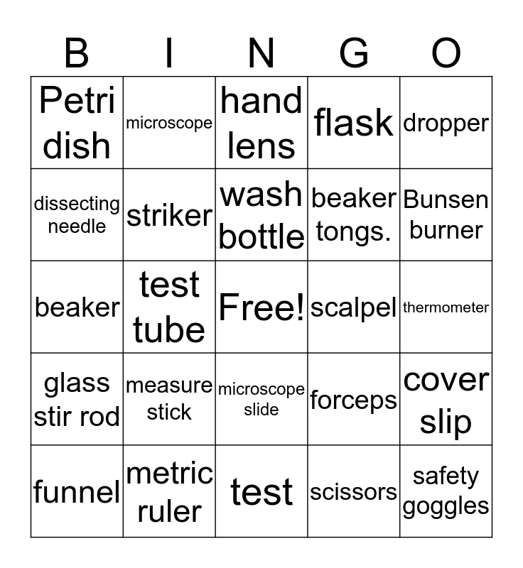 This bingo card has a free space and 24 words: measure stick, metric ruler, wash bottle, funnel, dropper, Petri dish, dissecting needle, microscope, scalpel, microscope slide, beaker tongs., beaker, forceps, cover slip, striker, scissors, thermometer, hand lens, Bunsen burner, test tube, safety goggles, glass stir rod, flask and test.