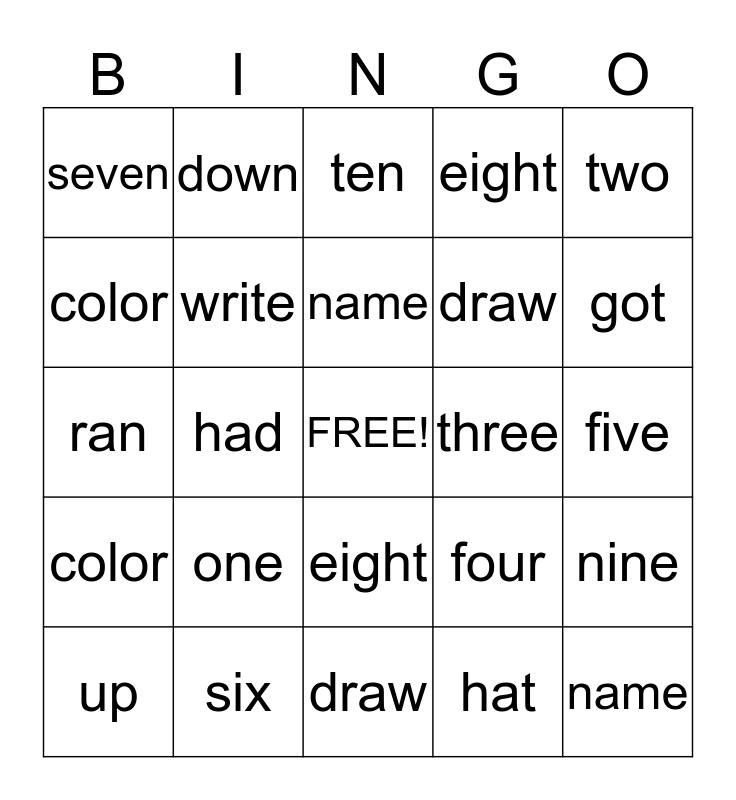This bingo card has a free space and 24 words: one, six, name, up, two, seven, color, down, three, eight, draw, ran, four, nine, write, hat, five, ten, got, had, name, color, eight and draw.