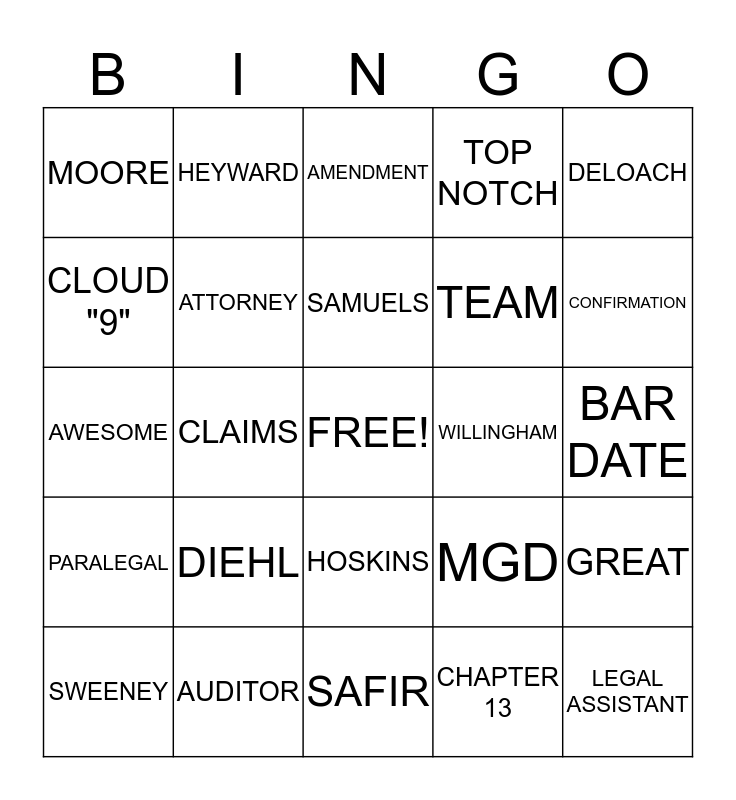 This bingo card has a free space and 25 words: DIEHL, SAFIR, SAMUELS, SWEENEY, DELOACH, MOORE, CLOUD "9", HEYWARD, WILLINGHAM, HOSKINS, TEAM, AWESOME, MGD, GREAT, ATTORNEY, CASE SET-UP, BAR DATE, AMENDMENT, CONFIRMATION, CLAIMS, LEGAL ASSISTANT, AUDITOR, PARALEGAL, TOP NOTCH and CHAPTER 13.