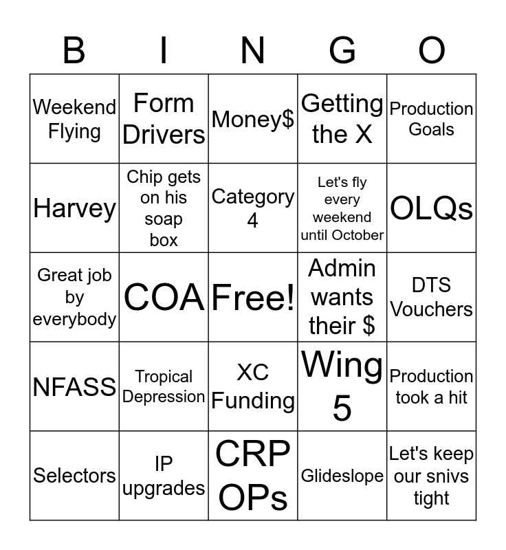 This bingo card has a free space and 24 words: Selectors, Tropical Depression, Category 4, Glideslope, Production Goals, Weekend Flying, Form Drivers, Money$, Admin wants their $, DTS Vouchers, Great job by everybody, Chip gets on his soap box, Wing 5, Production took a hit, Harvey, IP upgrades, CRP OPs, Getting the X, OLQs, NFASS, COA, XC Funding, Let's fly every weekend until October and Let's keep our snivs tight.