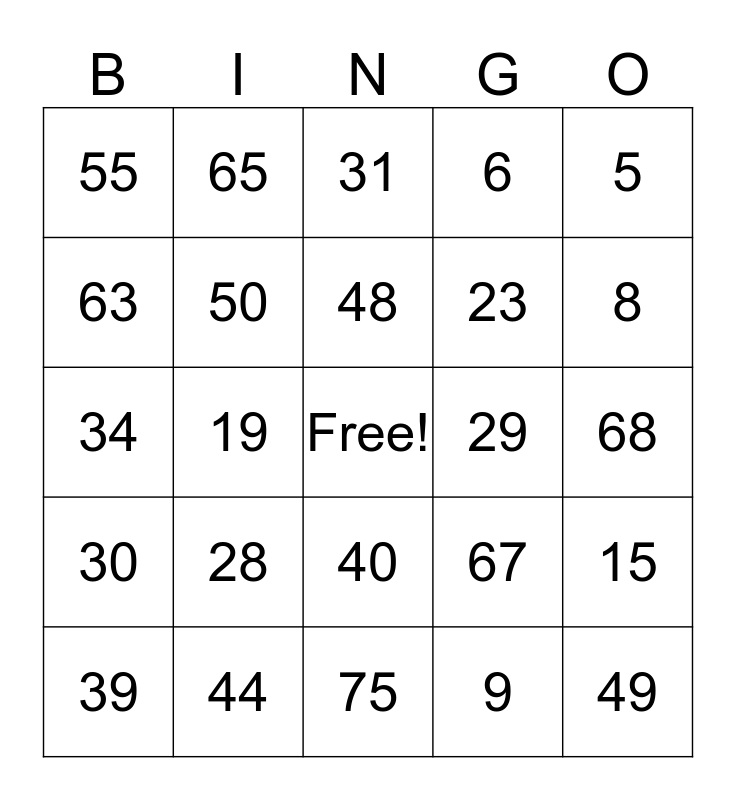 This bingo card has a free space and 75 words: 1, 16, 31, 46, 61, 2, 17, 32, 47, 62, 3, 18, 48, 63, 4, 19, 33, 49, 64, 5, 20, 34, 50, 65, 6, 21, 35, 51, 66, 7, 22, 36, 52, 67, 8, 23, 37, 53, 68, 9, 24, 38, 54, 69, 10, 25, 39, 55, 70, 11, 26, 40, 56, 71, 12, 27, 41, 57, 72, 13, 28, 42, 58, 73, 14, 29, 43, 59, 74, 15, 30, 44, 60, 75 and 45.