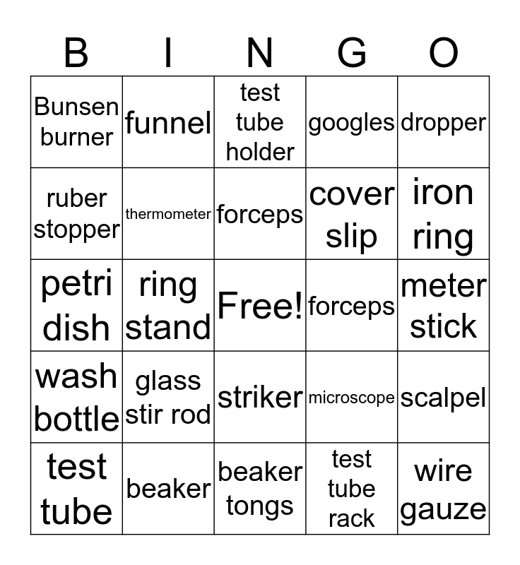 This bingo card has a free space and 24 words: glass stir rod, beaker, forceps, test tube, dropper, Bunsen burner, ruber stopper, funnel, forceps, striker, cover slip, petri dish, microscope, scalpel, thermometer, test tube rack, meter stick, test tube holder, iron ring, ring stand, wire gauze, wash bottle, googles and beaker tongs.