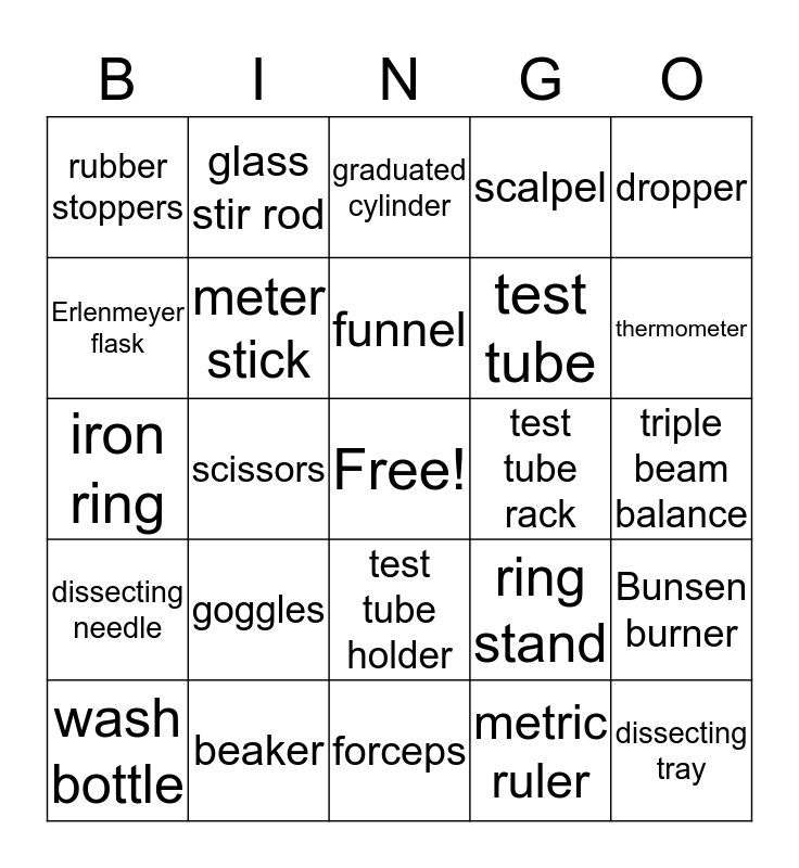 This bingo card has a free space and 24 words: goggles, beaker, funnel, wash bottle, dropper, rubber stoppers, Erlenmeyer flask, glass stir rod, test tube rack, test tube holder, test tube, iron ring, ring stand, Bunsen burner, meter stick, metric ruler, triple beam balance, graduated cylinder, thermometer, scissors, dissecting tray, dissecting needle, scalpel and forceps.