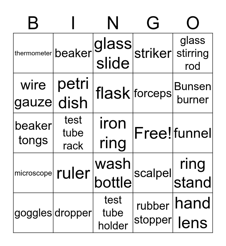 This bingo card has a free space and 24 words: ruler, dropper, flask, goggles, glass stirring rod, thermometer, wire gauze, beaker, Free!, wash bottle, forceps, beaker tongs, scalpel, ring stand, petri dish, rubber stopper, funnel, glass slide, Bunsen burner, test tube rack, hand lens, microscope, striker and test tube holder.