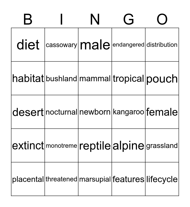 This bingo card has 25 words: monotreme, marsupial, mammal, placental, distribution, diet, habitat, cassowary, kangaroo, reptile, tropical, desert, alpine, grassland, bushland, lifecycle, female, male, pouch, nocturnal, newborn, threatened, extinct, endangered and features.