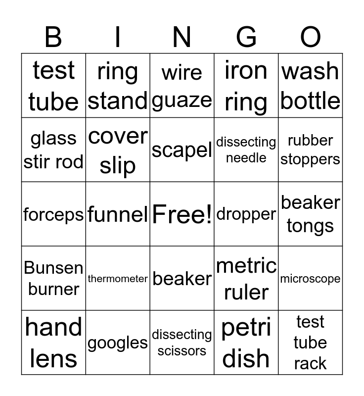 This bingo card has a free space and 24 words: thermometer, googles, scapel, hand lens, wash bottle, test tube, glass stir rod, ring stand, dropper, beaker, dissecting needle, forceps, metric ruler, microscope, cover slip, petri dish, beaker tongs, wire guaze, rubber stoppers, funnel, test tube rack, Bunsen burner, iron ring and dissecting scissors.