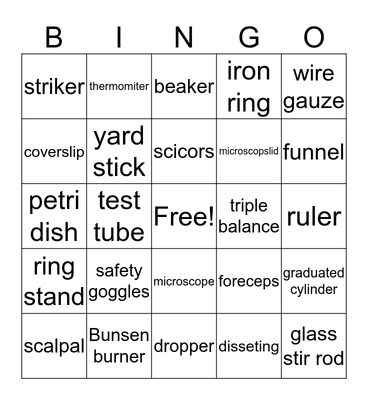 This bingo card has a free space and 24 words: safety goggles, Bunsen burner, scicors, scalpal, wire gauze, striker, coverslip, thermomiter, triple balance, microscope, microscopslid, petri dish, foreceps, graduated cylinder, yard stick, disseting, ruler, beaker, funnel, test tube, glass stir rod, ring stand, iron ring and dropper.