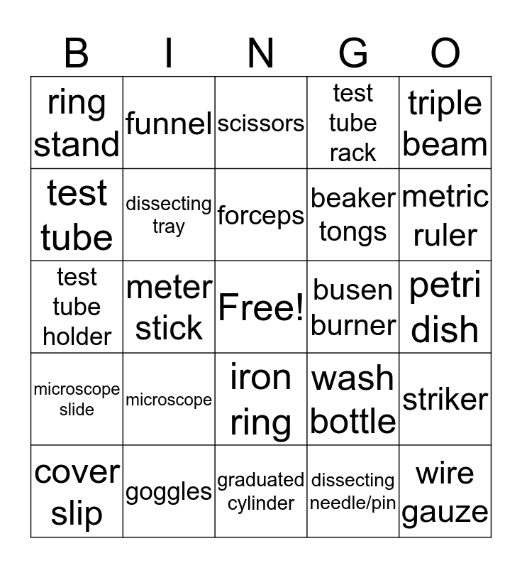 This bingo card has a free space and 24 words: microscope, goggles, forceps, cover slip, triple beam, ring stand, test tube, funnel, busen burner, iron ring, beaker tongs, test tube holder, wash bottle, striker, dissecting tray, dissecting needle/pin, petri dish, scissors, metric ruler, meter stick, wire gauze, microscope slide, test tube rack and graduated cylinder.