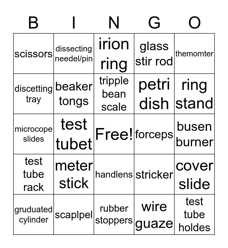 This bingo card has a free space and 24 words: meter stick, scaplpel, tripple bean scale, gruduated cylinder, themomter, scissors, discetting tray, dissecting needel/pin, forceps, handlens, petri dish, microcope slides, stricker, cover slide, beaker tongs, wire guaze, busen burner, irion ring, ring stand, test tubet, test tube holdes, test tube rack, glass stir rod and rubber stoppers.