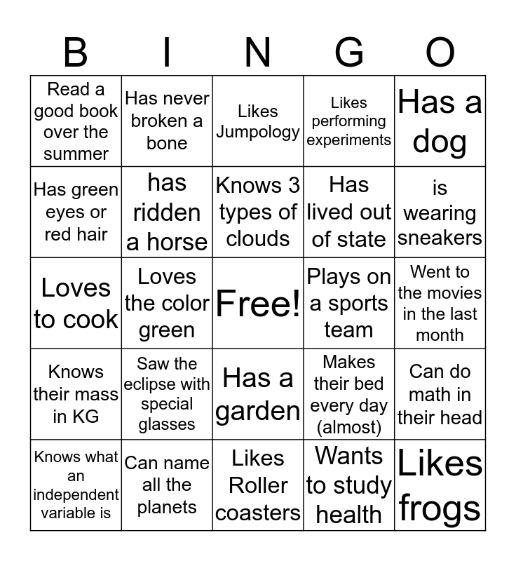 This bingo card has a free space and 24 words: Saw the eclipse with special glasses, Can name all the planets, Knows 3 types of clouds, Knows what an independent variable is, Has a dog, Read a good book over the summer, Has green eyes or red hair, Has never broken a bone, Plays on a sports team, Has a garden, Has lived out of state, Loves to cook, Makes their bed every day (almost), Can do math in their head, has ridden a horse, Wants to study health, Went to the movies in the last month, Likes Jumpology, is wearing sneakers, Loves the color green, Likes frogs, Knows their mass in KG, Likes performing experiments and Likes Roller coasters.