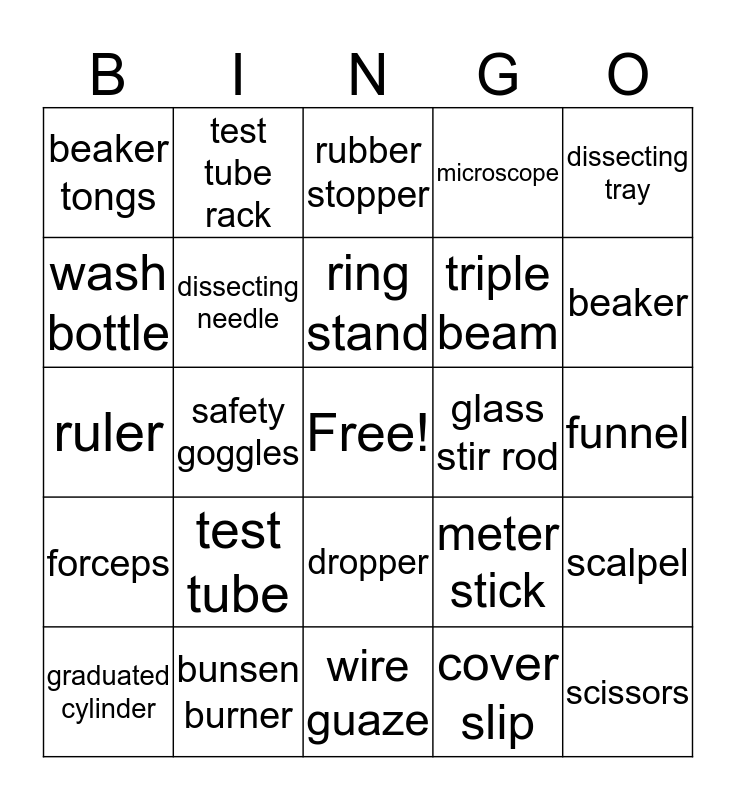 This bingo card has a free space and 24 words: test tube, bunsen burner, ring stand, graduated cylinder, dissecting tray, beaker tongs, wash bottle, test tube rack, glass stir rod, dropper, triple beam, ruler, meter stick, scalpel, dissecting needle, cover slip, funnel, rubber stopper, beaker, safety goggles, scissors, forceps, microscope and wire guaze.
