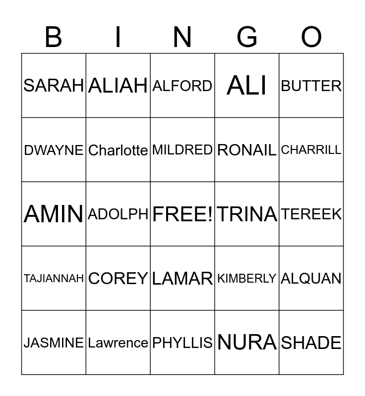 This bingo card has a free space and 24 words: COREY, Lawrence, MILDRED, JASMINE, BUTTER, SARAH, DWAYNE, ALIAH, TRINA, LAMAR, RONAIL, AMIN, KIMBERLY, ALQUAN, Charlotte, NURA, TEREEK, ALFORD, CHARRILL, ADOLPH, SHADE, TAJIANNAH, ALI and PHYLLIS.