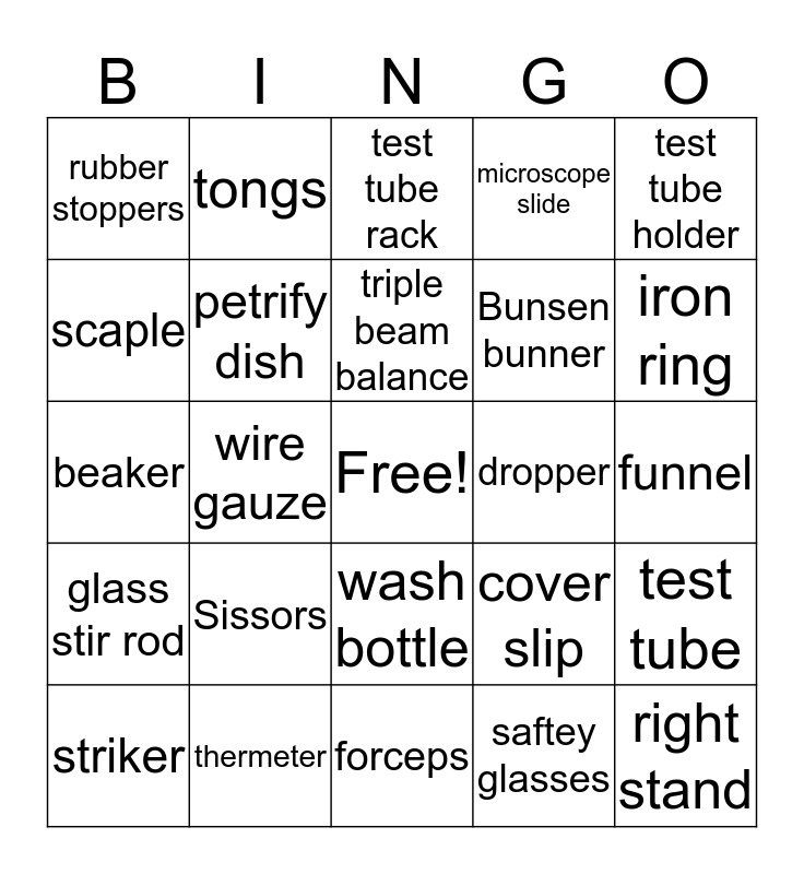 This bingo card has a free space and 24 words: Sissors, thermeter, triple beam balance, striker, test tube holder, rubber stoppers, scaple, tongs, dropper, wash bottle, Bunsen bunner, beaker, cover slip, test tube, petrify dish, saftey glasses, funnel, test tube rack, iron ring, wire gauze, right stand, glass stir rod, microscope slide and forceps.
