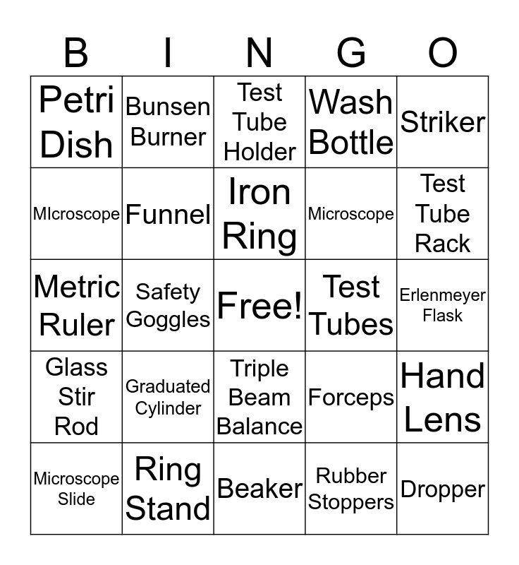 This bingo card has a free space and 24 words: Graduated Cylinder, Ring Stand, Iron Ring, Microscope Slide, Striker, Petri Dish, MIcroscope, Bunsen Burner, Test Tubes, Triple Beam Balance, Microscope, Metric Ruler, Forceps, Hand Lens, Funnel, Rubber Stoppers, Erlenmeyer Flask, Test Tube Holder, Test Tube Rack, Safety Goggles, Dropper, Glass Stir Rod, Wash Bottle and Beaker.