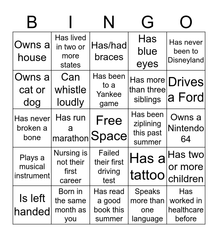 This bingo card has a free space and 24 words: Nursing is not their first career, Born in the same month as you, Has been to a Yankee game, Is left handed, Has never been to Disneyland, Owns a house, Owns a cat or dog, Has lived in two or more states, Has been ziplining this past summer, Failed their first driving test, Has more than three siblings, Has never broken a bone, Has a tattoo, Has two or more children, Can whistle loudly, Speaks more than one language, Owns a Nintendo 64, Has/had braces, Drives a Ford, Has run a marathon, Has worked in healthcare before, Plays a musical instrument, Has blue eyes and Has read a good book this summer.