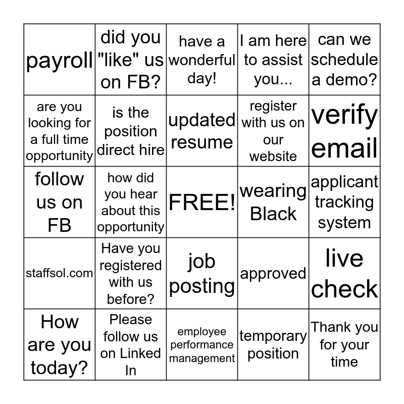This bingo card has a free space and 24 words: Have you registered with us before?, Please follow us on Linked In, updated resume, How are you today?, can we schedule a demo?, payroll, are you looking for a full time opportunity, did you "like" us on FB?, wearing Black, job posting, register with us on our website, follow us on FB, approved, live check, is the position direct hire, temporary position, applicant tracking system, have a wonderful day!, verify email, how did you hear about this opportunity, Thank you for your time, staffsol.com, I am here to assist you... and employee performance management.