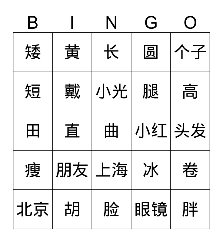 This bingo card has a free space and 24 words: 朋友, 胡, 小光, 北京, 个子, 矮, 短, 黄, 小红, 上海, 腿, 田, 冰, 卷, 戴, 眼镜, 头发, 长, 高, 直, 胖, 瘦, 圆 and 脸.