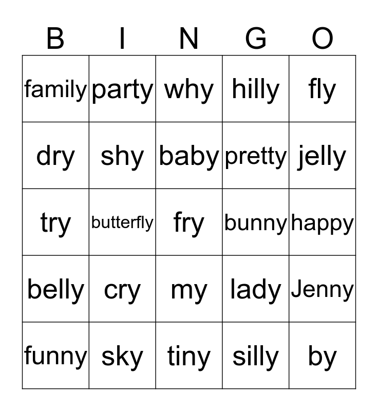 This bingo card has a free space and 24 words: funny, cry, baby, silly, fly, family, party, why, bunny, happy, try, shy, lady, Jenny, dry, sky, tiny, hilly, jelly, belly, butterfly, my, pretty and by.