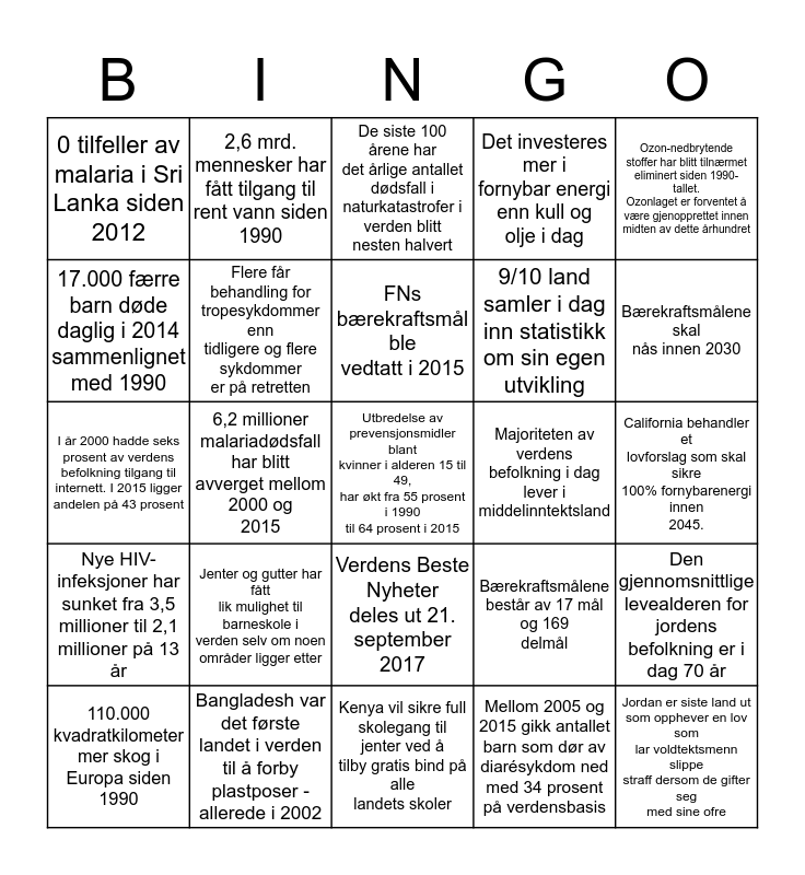 This bingo card has 25 words: Jenter og gutter har fått lik mulighet til barneskole i verden selv om noen områder ligger etter, Kenya vil sikre full skolegang til jenter ved å tilby gratis bind på alle landets skoler, FNs bærekraftsmål ble vedtatt i 2015, 110.000 kvadratkilometer mer skog i Europa siden 1990, Ozon-nedbrytende stoffer har blitt tilnærmet eliminert siden 1990-tallet. Ozonlaget er forventet å være gjenopprettet innen midten av dette århundret, 0 tilfeller av malaria i Sri Lanka siden 2012, 17.000 færre barn døde daglig i 2014 sammenlignet med 1990, 2,6 mrd. mennesker har fått tilgang til rent vann siden 1990, Majoriteten av verdens befolkning i dag lever i middelinntektsland, Verdens Beste Nyheter deles ut 21. september 2017, 9/10 land samler i dag inn statistikk om sin egen utvikling, I år 2000 hadde seks prosent av verdens befolkning tilgang til internett. I 2015 ligger andelen på 43 prosent, Bærekraftsmålene består av 17 mål og 169 delmål, Den gjennomsnittlige levealderen for jordens befolkning er i dag 70 år, Flere får behandling for tropesykdommer enn tidligere og flere sykdommer er på retretten, Jordan er siste land ut som opphever en lov som lar voldtektsmenn slippe straff dersom de gifter seg med sine ofre, California behandler et lovforslag som skal sikre 100% fornybarenergi innen 2045., De siste 100 årene har det årlige antallet dødsfall i naturkatastrofer i verden blitt nesten halvert, Bærekraftsmålene skal nås innen 2030, 6,2 millioner malariadødsfall har blitt avverget mellom 2000 og 2015, Utbredelse av prevensjonsmidler blant kvinner i alderen 15 til 49, har økt fra 55 prosent i 1990 til 64 prosent i 2015, Bangladesh var det første landet i verden til å forby plastposer - allerede i 2002, Nye HIV-infeksjoner har sunket fra 3,5 millioner til 2,1 millioner på 13 år, Det investeres mer i fornybar energi enn kull og olje i dag and Mellom 2005 og 2015 gikk antallet barn som dør av diarésykdom ned med 34 prosent på verdensbasis.
