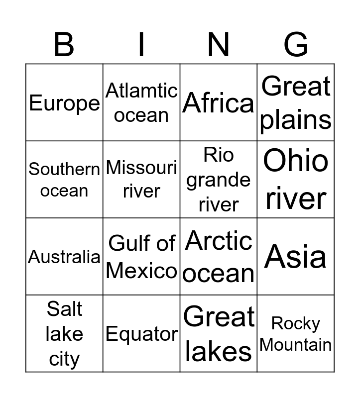 This bingo card has 16 words: Equator, Asia, Africa, Europe, Australia, Atlamtic ocean, Arctic ocean, Great lakes, Southern ocean, Missouri river, Salt lake city, Great plains, Gulf of Mexico, Ohio river, Rio grande river and Rocky Mountain.