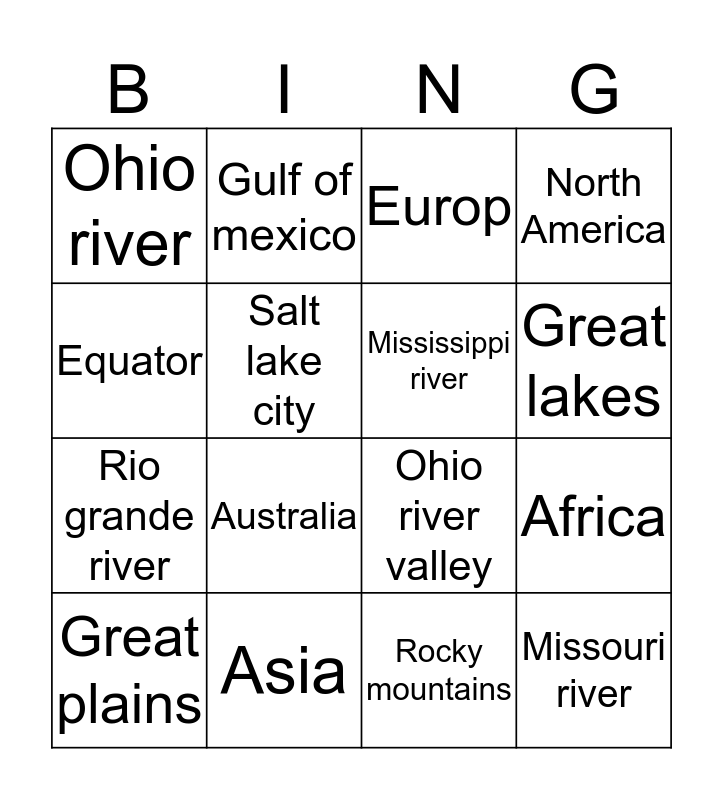 This bingo card has 16 words: Asia, Africa, Europ, Ohio river, Rio grande river, Gulf of mexico, Ohio river valley, Rocky mountains, Equator, Salt lake city, Great plains, North America, Australia, Great lakes, Mississippi river and Missouri river.
