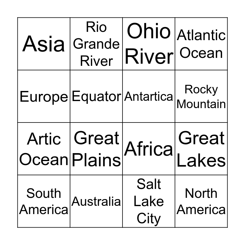 This bingo card has 16 words: Australia, Great Lakes, Ohio River, Asia, Artic Ocean, Rio Grande River, Africa, Salt Lake City, Europe, Equator, South America, Atlantic Ocean, Great Plains, Rocky Mountain, Antartica and North America.