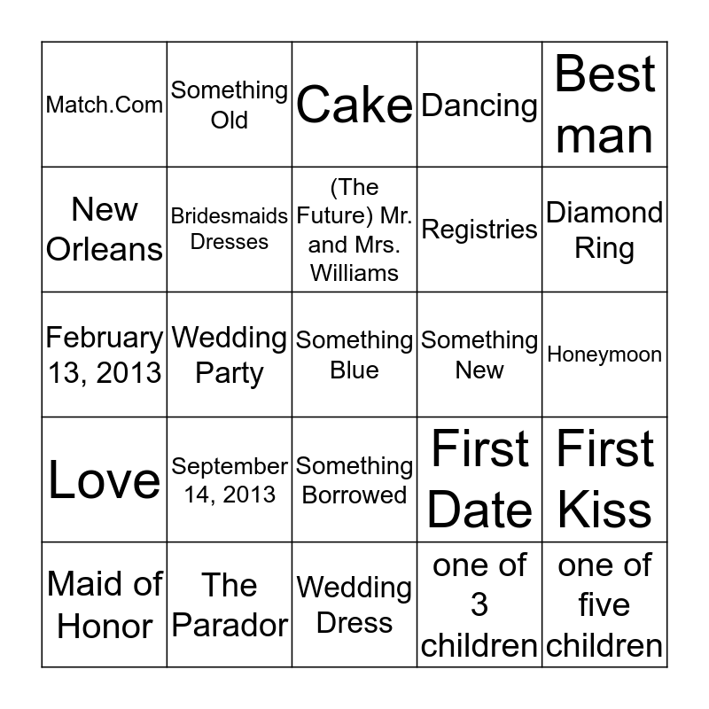 This bingo card has a free space and 24 words: September 14, 2013, The Parador, (The Future) Mr. and Mrs. Williams, Maid of Honor, Best man, Match.Com, New Orleans, Something Old, Something New, Something Borrowed, Registries, February 13, 2013, First Date, First Kiss, Bridesmaids Dresses, one of 3 children, Honeymoon, Cake, Diamond Ring, Wedding Party, one of five children, Love, Dancing and Wedding Dress.