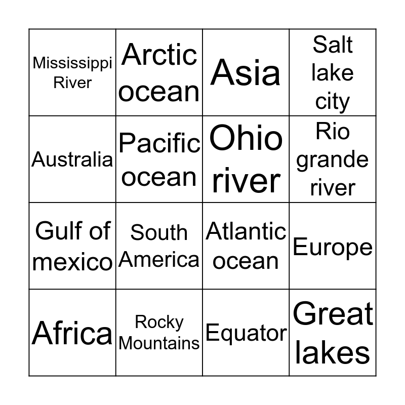 This bingo card has 16 words: Rocky Mountains, Europe, Asia, Mississippi River, Gulf of mexico, Arctic ocean, Atlantic ocean, Equator, Australia, Pacific ocean, Africa, Salt lake city, South America, Rio grande river, Ohio river and Great lakes.