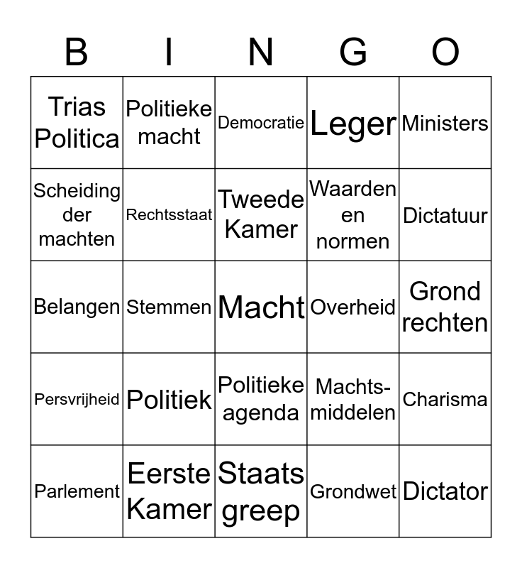 This bingo card has a free space and 24 words: Politiek, Eerste Kamer, Tweede Kamer, Parlement, Ministers, Trias Politica, Scheiding der machten, Politieke macht, Overheid, Politieke agenda, Waarden en normen, Belangen, Machts- middelen, Charisma, Rechtsstaat, Grondwet, Grond rechten, Democratie, Dictatuur, Stemmen, Dictator, Persvrijheid, Leger and Staats greep.
