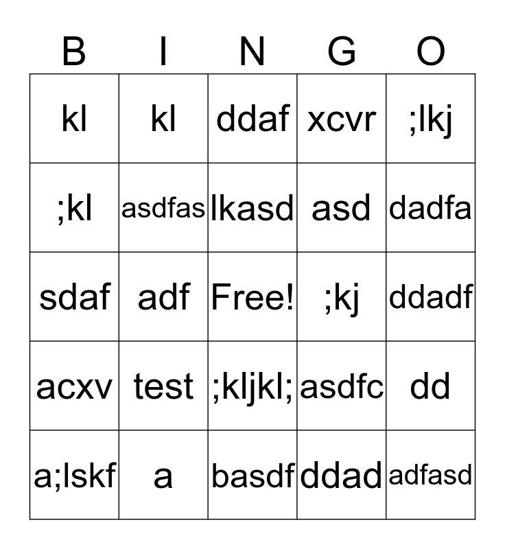 This bingo card has a free space and 24 words: test, a, lkasd, a;lskf, ;lkj, kl, ;kl, kl, ;kj, ;kljkl;, asd, sdaf, asdfc, dd, asdfas, ddad, ddadf, ddaf, dadfa, adf, adfasd, acxv, xcvr and basdf.