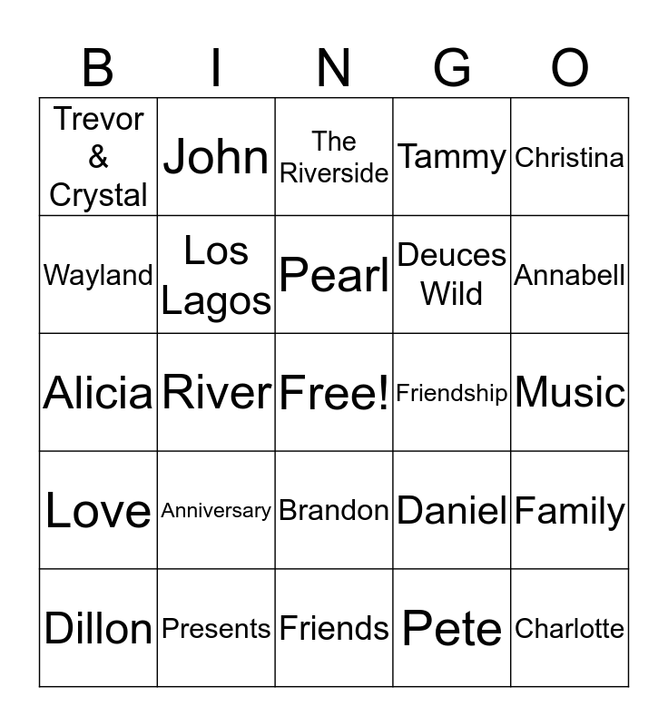 This bingo card has a free space and 60 words: 30th, Presents, September 26th, Friendship, Jet Skies, Slots, Los Lagos, Alexis, Tammy, Tim, Wayland, Lori, Pearl, Food, Las Vegas, Trevor & Crystal, River, The Riverside, Kathy, Annabell, Alicia, John, Wyatt, Daniel, Party, Drinks, Laughlin, Kathryn & Colin, Deuces Wild, Chapel Of Love, Matt & Shannon, Eli, Dan, Marlene, Christina, Dillon, Deborah, Friends, Fun, Music, Poker, Anniversary, Brandon, Deyja, Charlotte, Tiffani, Brittany, Lauren, Greg, Family, Love, Games, Black Jack, Celebration, Kammi & Danny, Mike & Ana, Sara, Crystal, Pete and Happiness.