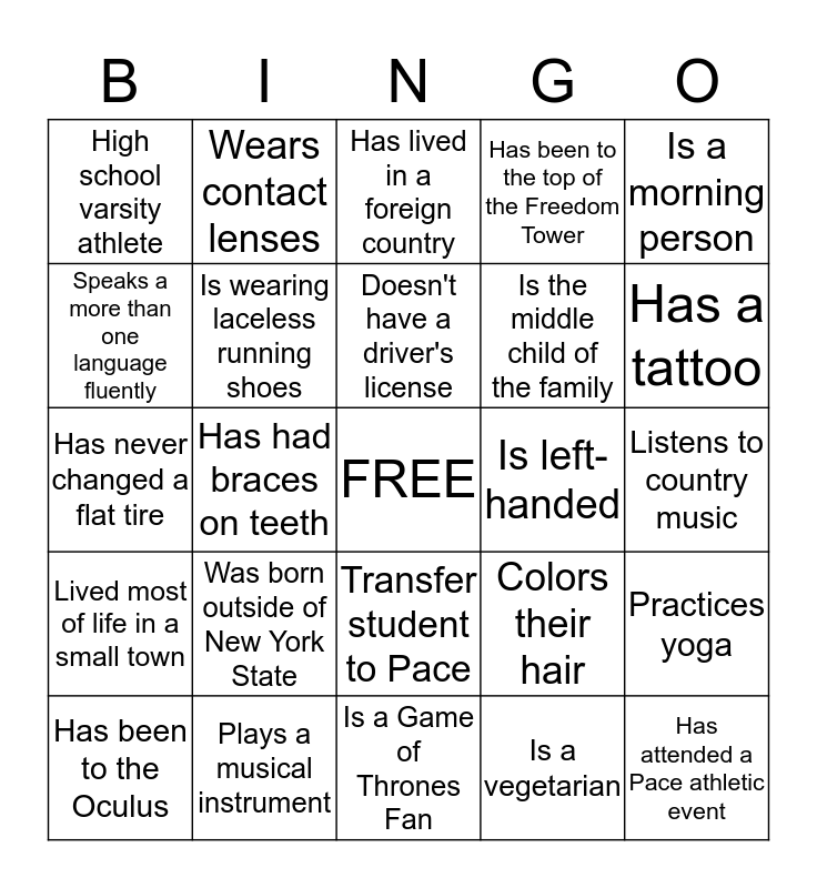 This bingo card has a free space and 24 words: Was born outside of New York State, Plays a musical instrument, Doesn't have a driver's license, Has been to the Oculus, Is a morning person, High school varsity athlete, Speaks a more than one language fluently, Wears contact lenses, Is left-handed, Transfer student to Pace, Is the middle child of the family, Has never changed a flat tire, Colors their hair, Practices yoga, Is wearing laceless running shoes, Is a vegetarian, Listens to country music, Has lived in a foreign country, Has a tattoo, Has had braces on teeth, Has attended a Pace athletic event, Lived most of life in a small town, Has been to the top of the Freedom Tower and Is a Game of Thrones Fan.