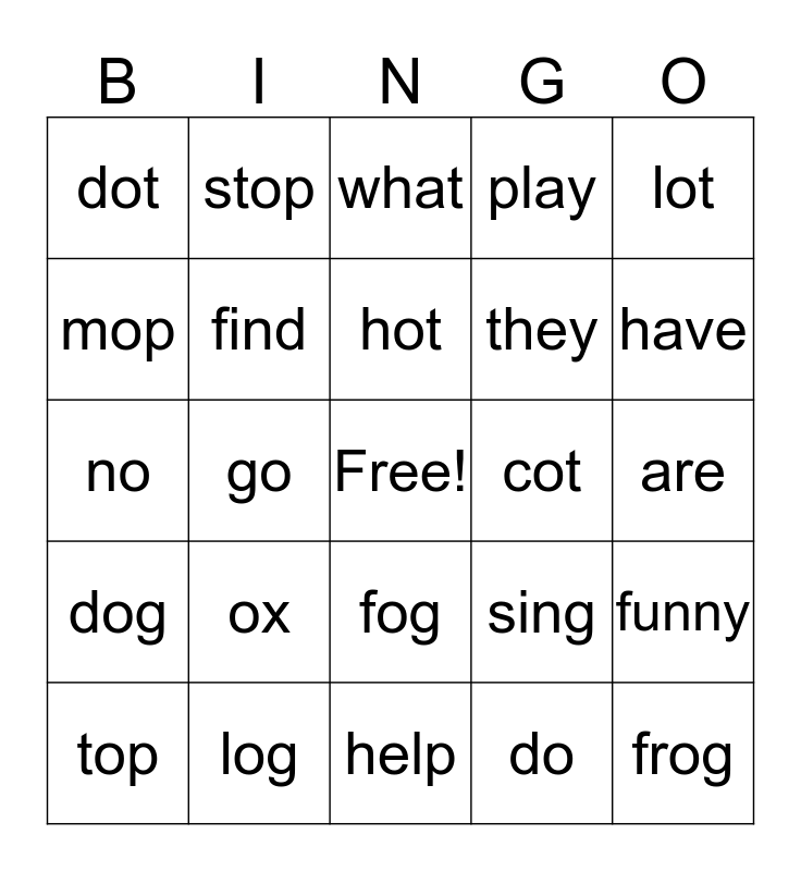 This bingo card has a free space and 24 words: ox, log, hot, top, lot, dot, mop, stop, cot, fog, they, no, sing, funny, find, do, are, what, have, go, frog, dog, play and help.