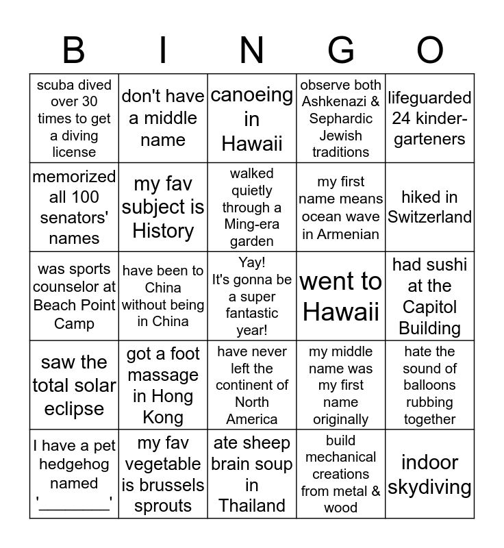 This bingo card has a free space and 24 words: got a foot massage in Hong Kong, my fav vegetable is brussels sprouts, walked quietly through a Ming-era garden, I have a pet hedgehog named '________', lifeguarded 24 kinder-garteners, scuba dived over 30 times to get a diving license, memorized all 100 senators' names, don't have a middle name, went to Hawaii, have never left the continent of North America, my first name means ocean wave in Armenian, was sports counselor at Beach Point Camp, my middle name was my first name originally, hate the sound of balloons rubbing together, my fav subject is History, build mechanical creations from metal & wood, had sushi at the Capitol Building, canoeing in Hawaii, hiked in Switzerland, have been to China without being in China, indoor skydiving, saw the total solar eclipse, observe both Ashkenazi & Sephardic Jewish traditions and ate sheep brain soup in Thailand.