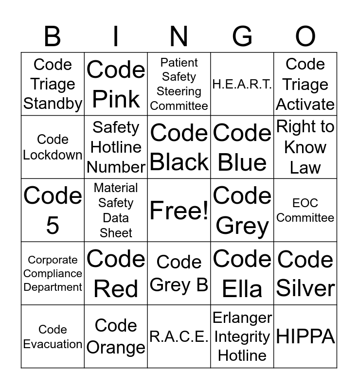 This bingo card has a free space and 24 words: Code Red, Code Orange, Code Black, Code Evacuation, Code Triage Activate, Code Triage Standby, Code Lockdown, Code Pink, Code Grey, Code Grey B, Code Blue, Code 5, Code Ella, Code Silver, Safety Hotline Number, Erlanger Integrity Hotline, EOC Committee, Patient Safety Steering Committee, Right to Know Law, Material Safety Data Sheet, HIPPA, Corporate Compliance Department, H.E.A.R.T. and R.A.C.E..