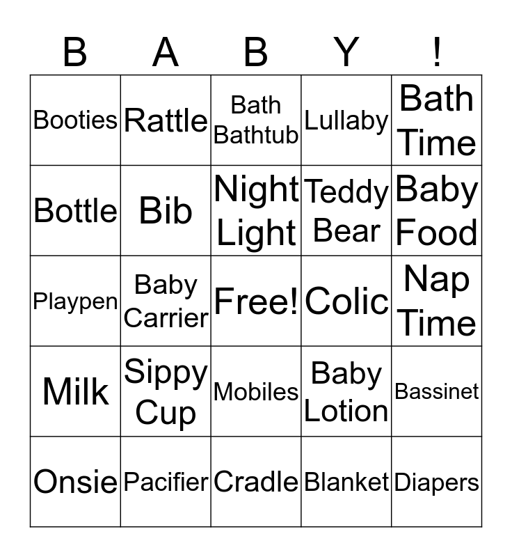 This bingo card has a free space and 24 words: Sippy Cup, Pacifier, Night Light, Onsie, Bath Time, Booties, Bottle, Rattle, Colic, Mobiles, Teddy Bear, Playpen, Baby Lotion, Bassinet, Bib, Blanket, Nap Time, Bath Bathtub, Baby Food, Baby Carrier, Diapers, Milk, Lullaby and Cradle.